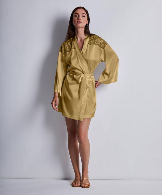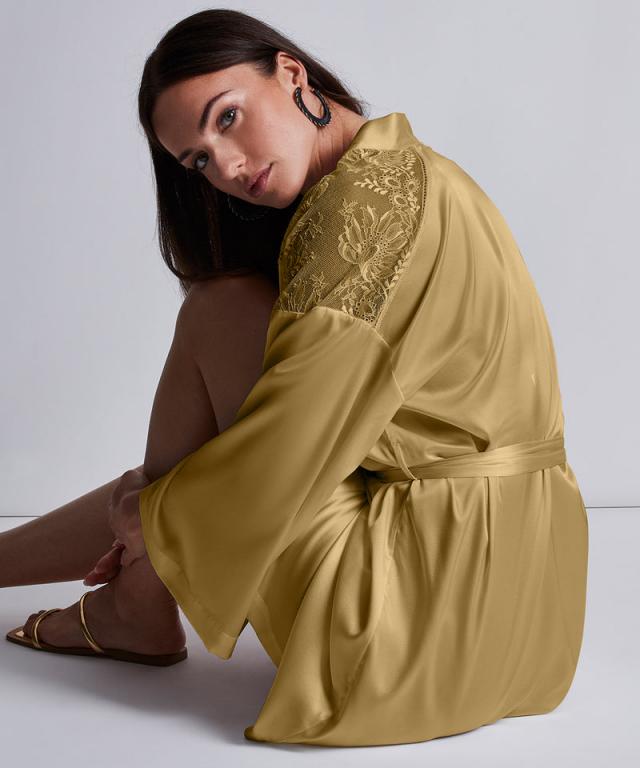 Résolument élégant, le kimono Midnight Whisper modernise l’iconique tenue traditionnelle du Japon dans une soie fluide et délicate, rehaussée de détails raffinés. Comprenant une ceinture plate amovible qui permet de créer différents styles, il se pare, sur les épaules, d’empiècements en dentelle ajourée pour une silhouette structurée et très sexy.Les spécificités du kimono Midnight Whisper: Un élégant kimono, subtil mélange de soie et de dentelle raffinées